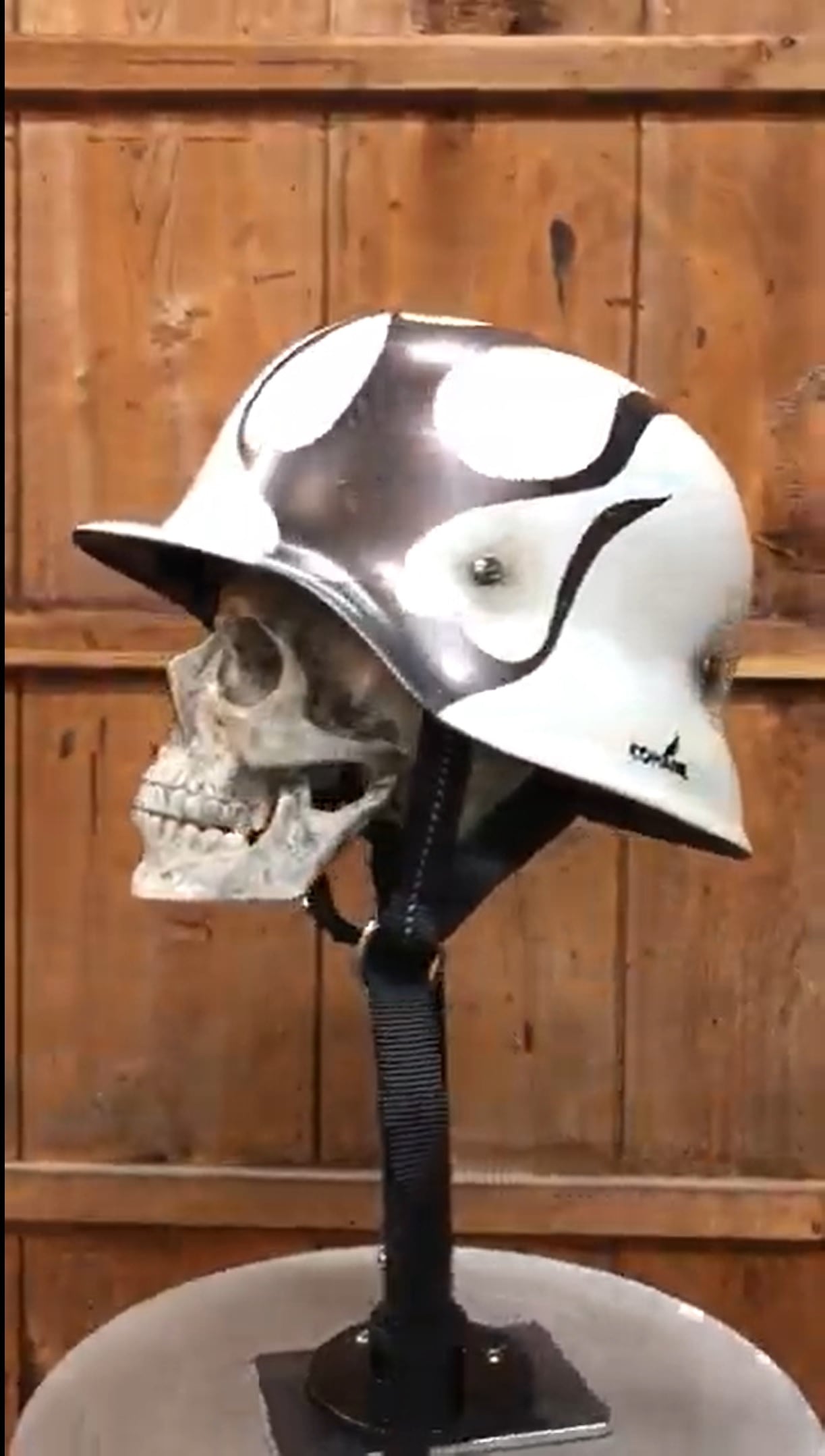 純白をベースにライトエイジングを施しました。 ファイヤーパターン部分は極限まで燻しブラックメタリク調に表現しております。 帽体はoceanbeetleのSRFを使用しております。 サイズ S,M